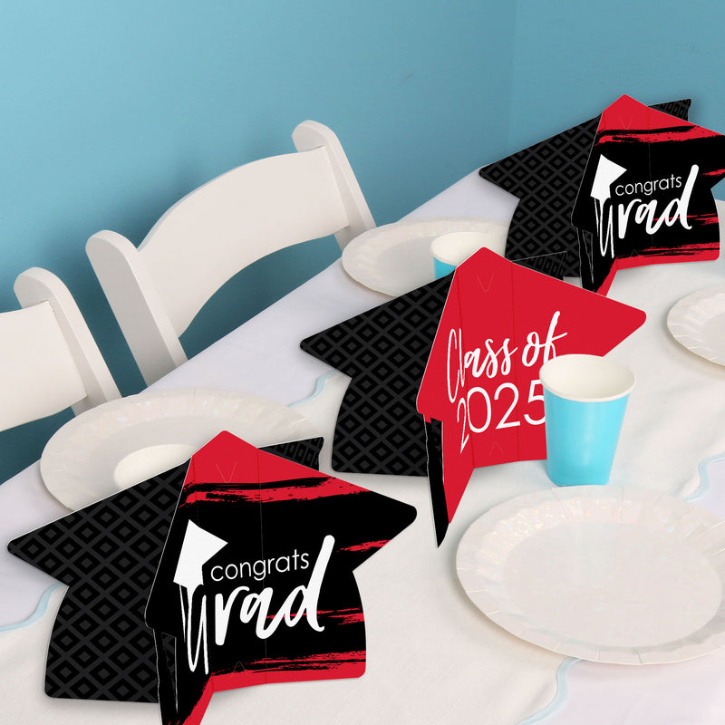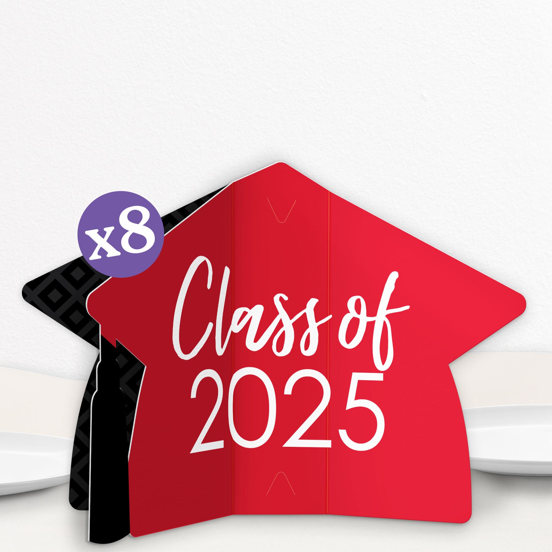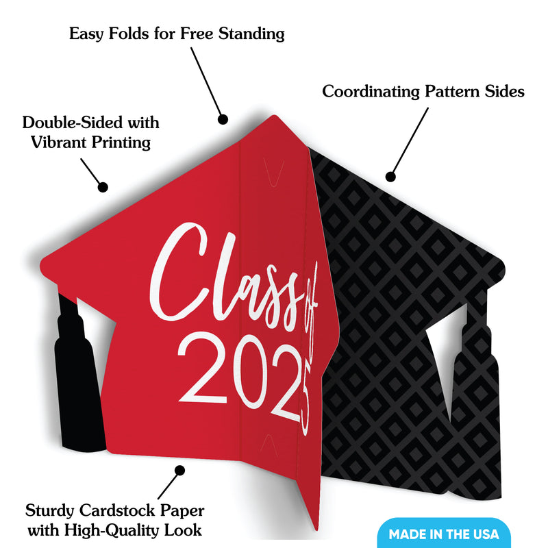 Celebrate your graduate in style with this set of 8 Red Grad Cap 3D Table Centerpieces! This freestanding centerpiece set includes 4 “Class of 2026” grad caps and 4 “Congrats Grad” grad caps for a coordinated and festive display. Perfectly sized for dining tables, dessert displays, and gift tables, these red graduation party decorations are printed double-sided on sturdy cardstock paper with a photo-like shine. The red grad party theme design and coordinating pattern sides add a fun touch to any graduation party, from elementary to high school to college. Simple to assemble, these congrats grad table centerpieces stand tall and make an impact. Proudly made in the Midwest!