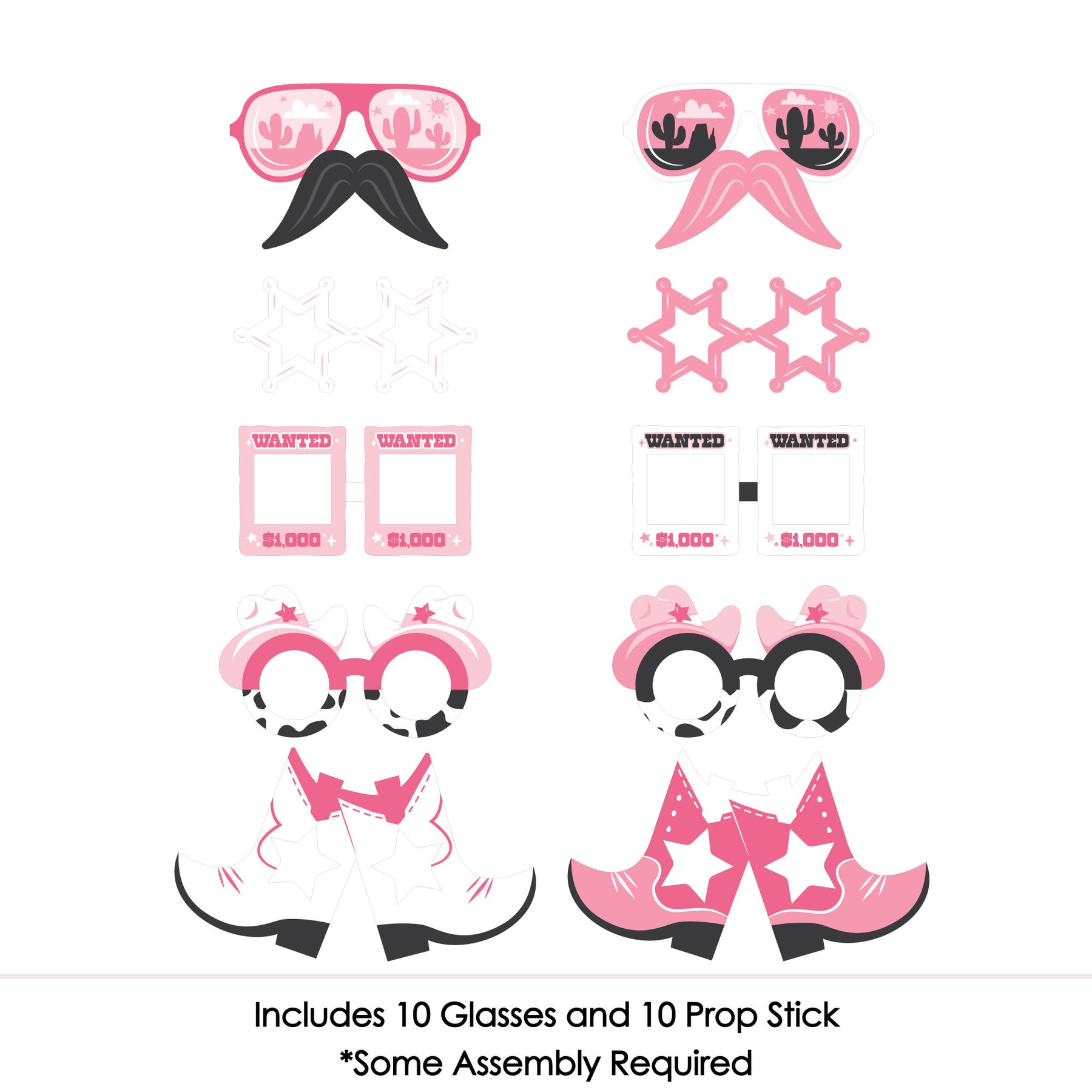 The perfect photo booth begins with fabulous photo booth props. Our printed and cut glasses prop kit will help you easily create fun party photos at your next Rodeo Cowgirl Party. This fun prop kit comes with 10 glasses and is ready for quick assembly. Simply add the included dowels to each piece, attach the included clear stickers, and display them alongside a fun photo booth backdrop.