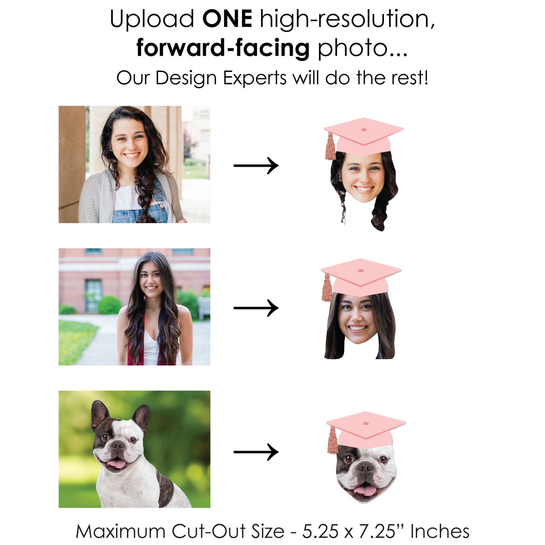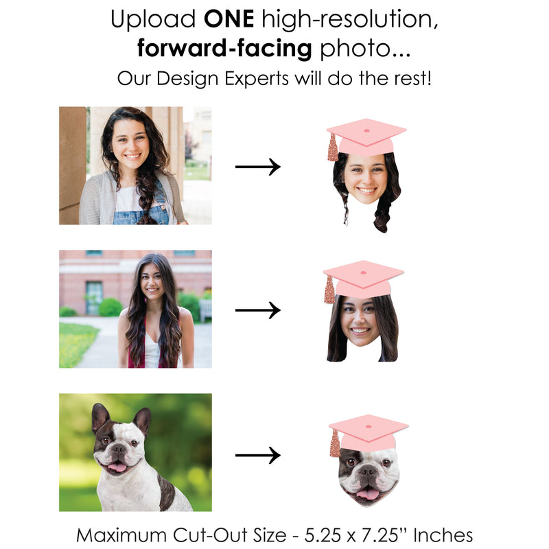 Make your graduation party unforgettable with our custom Fun Face large-shaped cutouts -complete with a festive rose gold grad cap! Featuring your gradโs smiling face, these decorations are perfect for banners, centerpieces, photo booths, or even the buffet table. Whether you hang them up, prop them on tables, or use them for fun photo ops, these personalized cutouts will make your celebration stand out. Each one arrives with your gradโs face printed on the front, topped with a bold pink graduation cap, and a white back. Get ready to cheer on your graduate in the most fun way possibleโbecause their big day deserves BIG decorations!