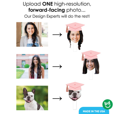 Celebrate your special someone with this set of 6 matching Graduation Fun Face Cutout Paddles. These fun and unique Graduation Party accessories will feature ONE custom photo face cut-out with 1 graduation hat design and will be a hilarious addition to your celebration. Capture silly snapshots when you use them as photo booth props or keep yourself cool when you use one as a handheld fan. Create memories of a lifetime when you use the personalized graduation party decorations at your celebration!