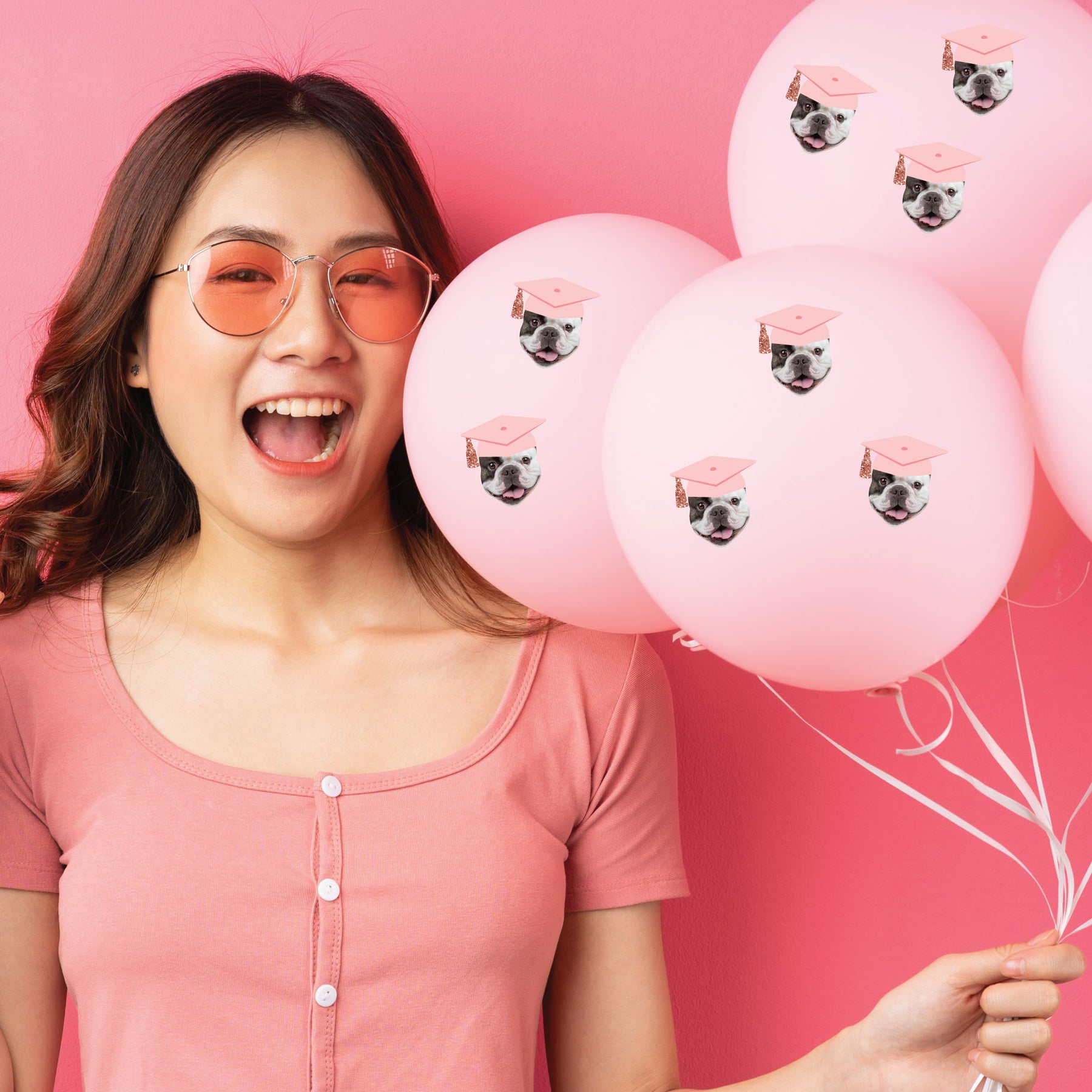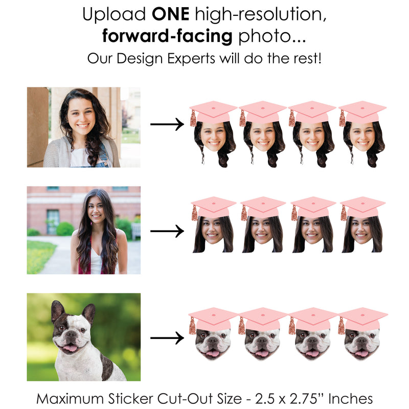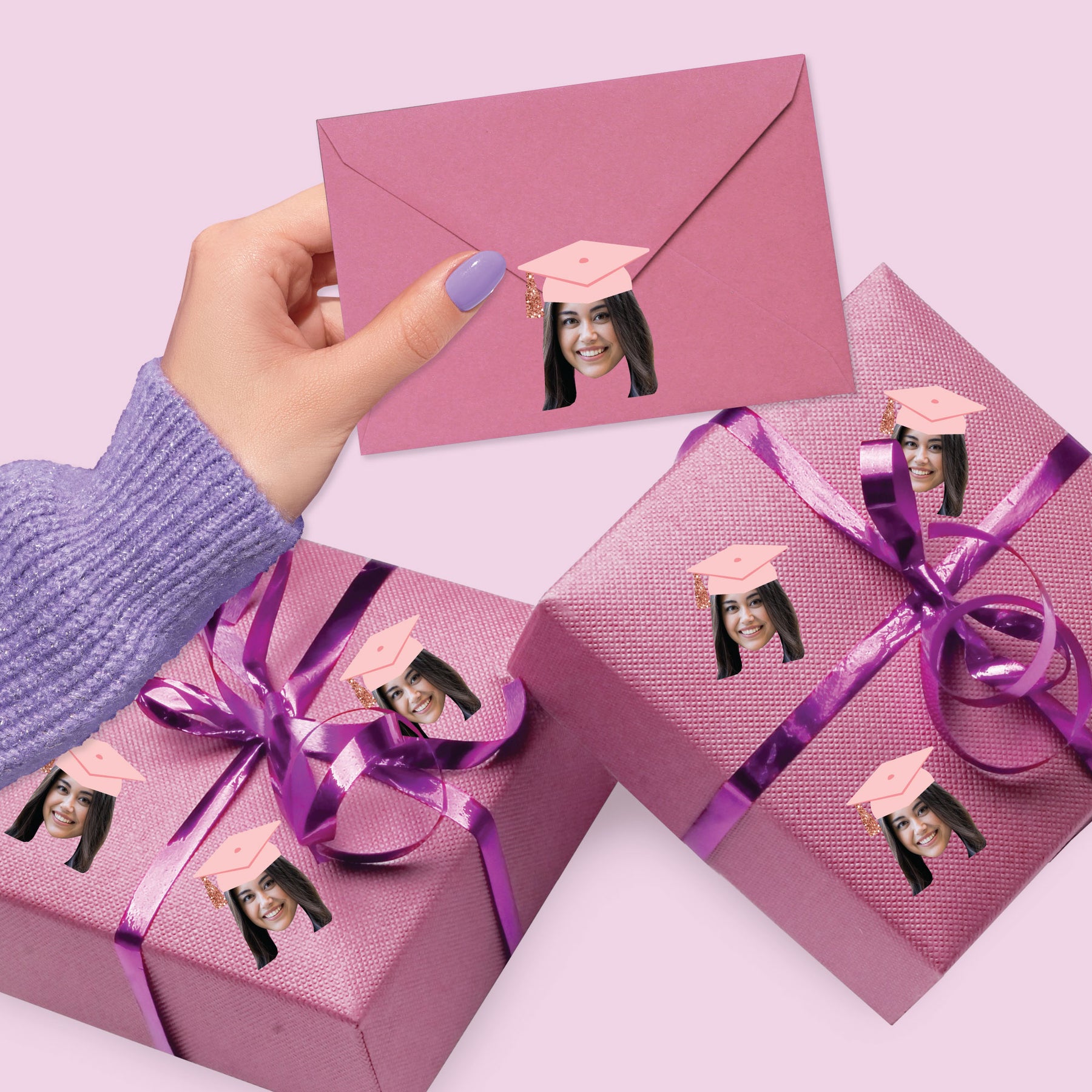 Get ready for some fun with the Photo Fun Face Cut-Out Stickers. This set of 24 die cut stickers features ONE face picture on 1 cut-out design with a pink grad cap and will be a great addition at your Party. Get creative when you incorporate them into your decorations by sticking them onto invitations, party hats, or wrapped treats. Or, hand them out to guests as playful party favors that can be used to adorn water bottles, electronics, planners, scrapbooks, and more! Professionally printed on waterproof sticker paper, the shaped Photo stickers are easy to use. Simply peel and stick on your desired surface. Whether you're celebrating a family member, dear friend, or even your beloved pet, these customized head cut-out stickers will add a charming and quirky touch to your occasion. From party decorations to everyday items, add some fun to your world with the personalized stickers!