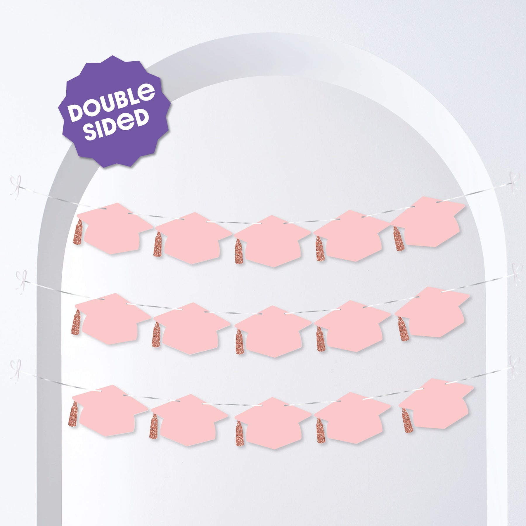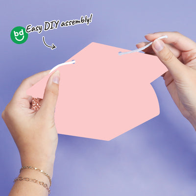 Brighten up your Graduation party with our rose gold grad cap-shaped garland banner! This cute decoration creates a joyful atmosphere for your gathering. Perfect for setting the tone as celebrate! Our banner is double-sided for maximum impact and comes with 15 feet of white cording for easy DIY setup.