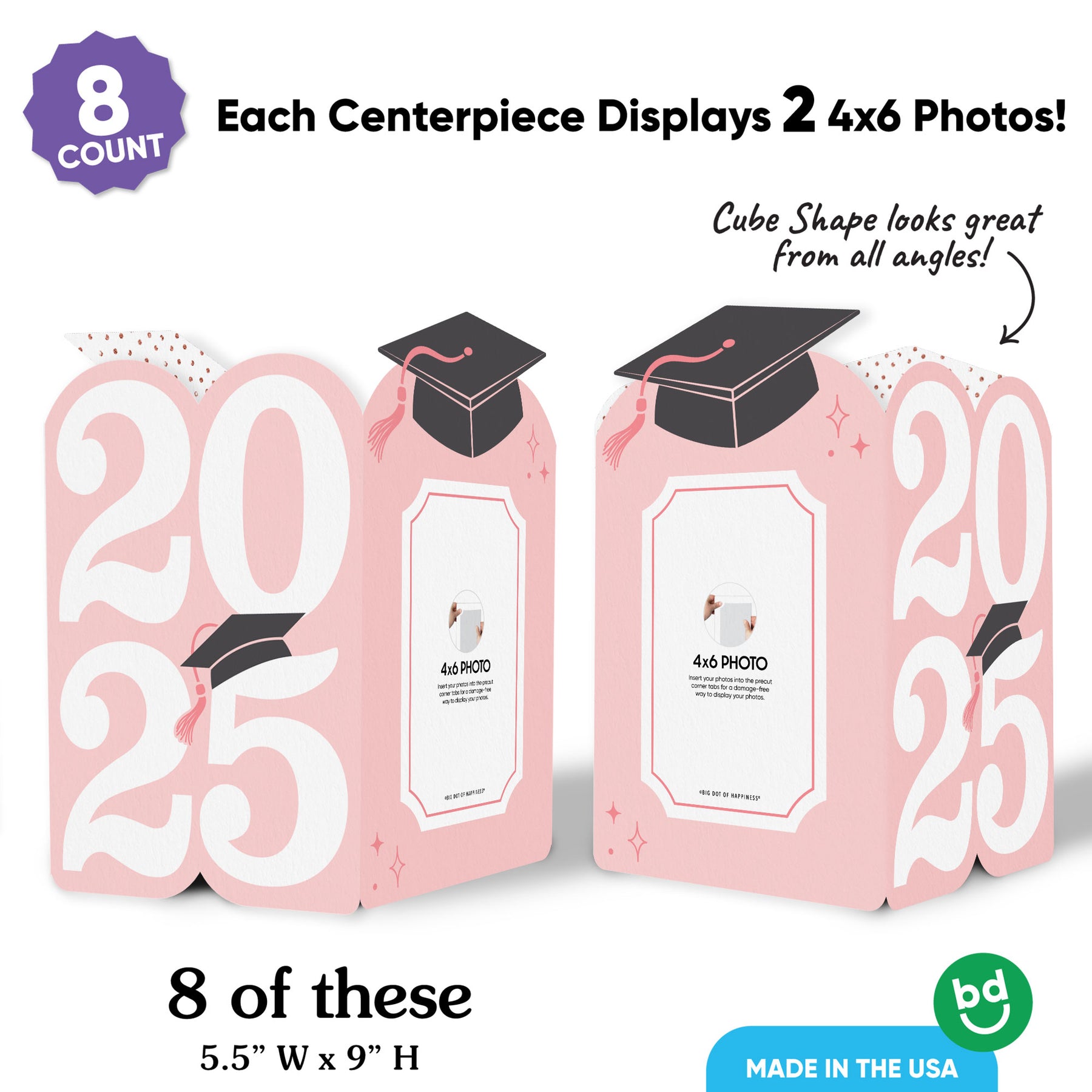 Planning a graduation party is no joke, but adding a personal touch has never been easier! These Rose Gold Graduation Party Photo Holder Centerpieces are a painless (and seriously fun) addition! This set of 8 cube-shaped centerpieces lets you show off your grad’s journey from kindergarten to senior year—perfect for displaying their K-12 school photos in one place. With space for up to 16 vertical 4x6 pictures, each centerpiece features two sides with secure tabs for photos and two sides with a bold “2026” design, making them a total conversation starter. Whether placed on dining tables, dessert stations, or the gift table, these centerpieces instantly add a personalized and festive touch. Want to get creative? Use them to hold 3-5” vases, 5” flower boxes, or even balloons for a custom party look. Made from sturdy cardstock paper with a glossy, photo-like finish, they arrive pre-assembled and ready to party—no DIY disasters here! Plus, with a coordinating interior pattern, they bring that polished, picture-perfect vibe to your pink-themed grad celebration. Proudly made in the Midwest, these Class of 2026 centerpieces are an easy win for any grad party!