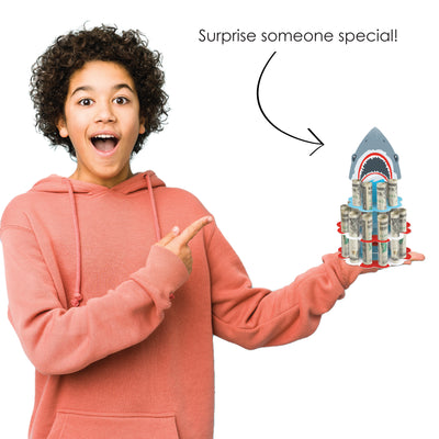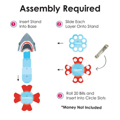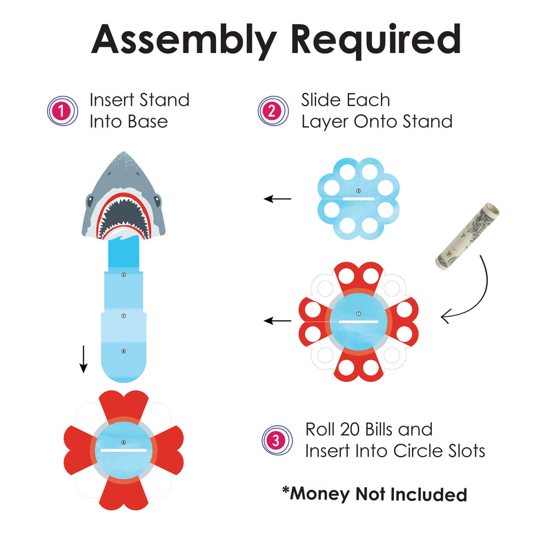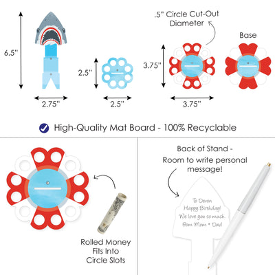 Wow the guest of honor when you present them with a Shark Zone Cash Cake at their Jawesome or Birthday Party! A fun and creative way to gift money, this DIY shark cash holder stand kit comes in a 2-tier cake shape when put together and will have 20 slots, size 0.5” in diameter, that can hold your rolled money. To assemble, simply attach the centerpiece stand through the base piece and fold the half-circle ends at the bottom in opposite directions. Secure them into place using adhesive dots. Then, slide your layers onto the stand and add your rolled-up bills into the circle slots. For a special touch, add in some rolled-up advice notes or write a personalized message on the backside of the stand. The Blue cash holder is an impressive gift and table party decoration statement piece that will delight your guest of honor and partygoers with its eye-catching display. They will appreciate receiving a practical and meaningful gift and enjoy the flexibility of using the cash gift however they choose. Surprise your recipient when you gift them with the Shark Zone Cash Cake.