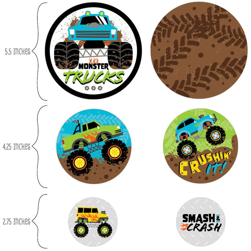 This Kit Includes 27 Confetti Pieces: 6 -5.5" party circles with Smash and Crash - Monster Truck 9 -4.25" party circles with Smash and Crash - Monster Truck 12 -2.75" party circles with Smash and Crash - Monster Truck