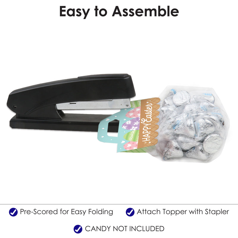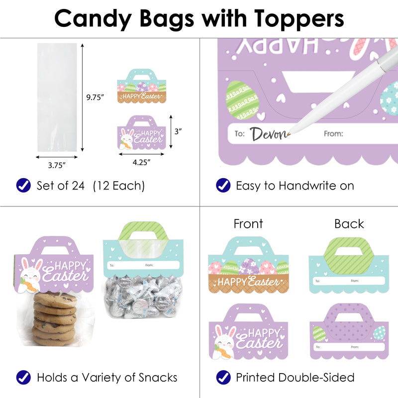 Delight your guests when you use the set of 24 Spring Easter Bunny Candy Bags with Toppers to add a little DIY magic to your Easter Party favors! Adorable and easy to use, this goodie kit includes food-safe clear treat bags and scalloped-edge topper labels with a built-in handle that come in 2 designs. Candy labels are professionally printed double-sided on sturdy cardstock paper and include a to and from section on the back for easy personalization. To use Spring Easter Bunny treat bags with toppers, begin by filling treats inside the plastic bag. Then, handwrite the information on the to and from section and let the ink dry before folding the label along the pre-scored line. Place the flaps over the top of the candy bag and secure it shut with staples. Spring Easter Bunny bag toppers measure 3” wide by 4.25” tall and clear bags measure 3.75” wide by 9.75” tall. Display candy bags with toppers at your dessert table or give them as take-home party favor bags. Make your celebration unforgettable when you present your guests with the Spring Easter Bunny Candy Bags with Toppers!