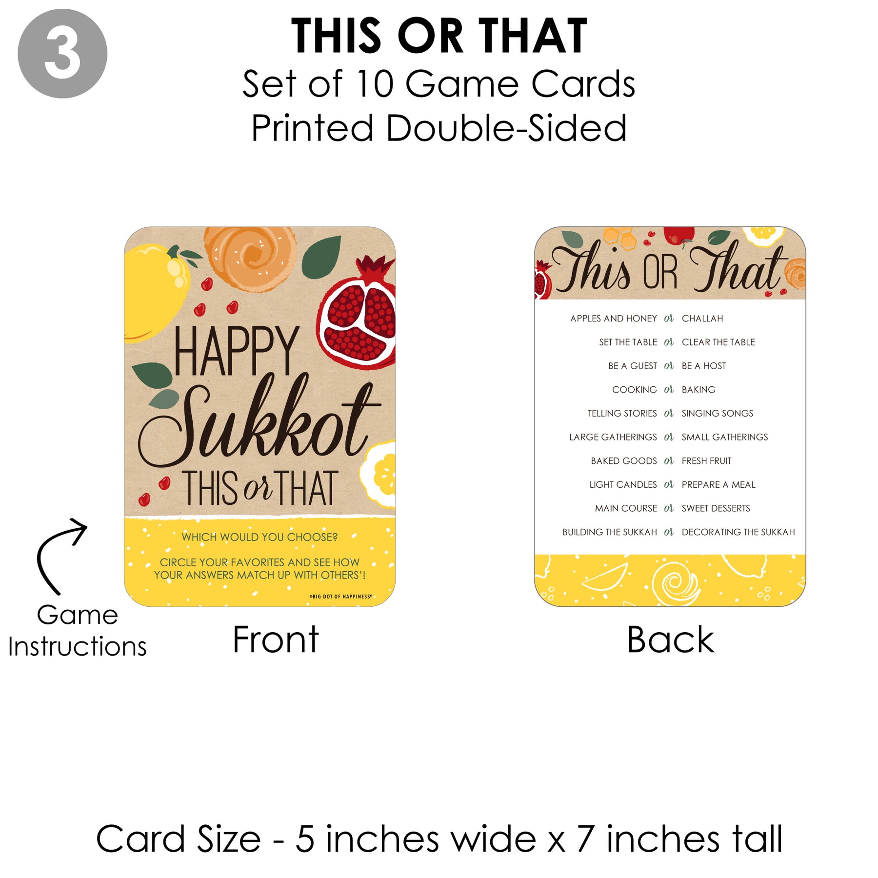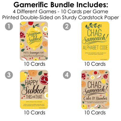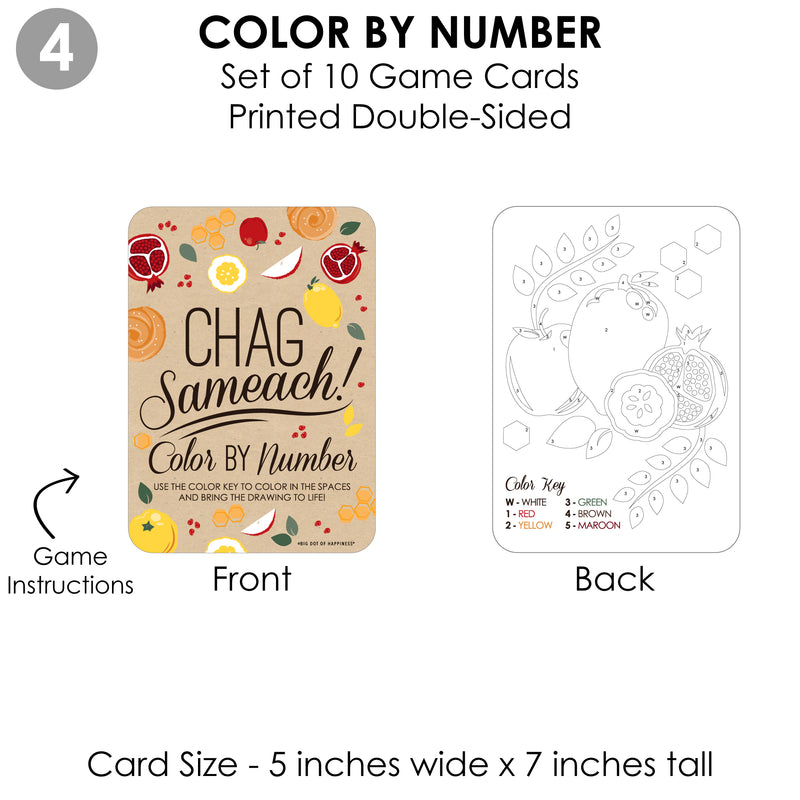Create a memorable Sukkah Jewish Holiday when you play Sukkot Gamerific Bundle. This game pack includes 4 different games: This or That, Alphabet Code, Color by Number, and Photo Scavenger Hunt. Professionally printed on sturdy cardstock paper, our Gamerific Bundle will arrive ready to play and each game card is printed with easy-to-follow playing instructions. For added fun, make each game competitive by adding a time limit and offering a prize to the winning party guest.