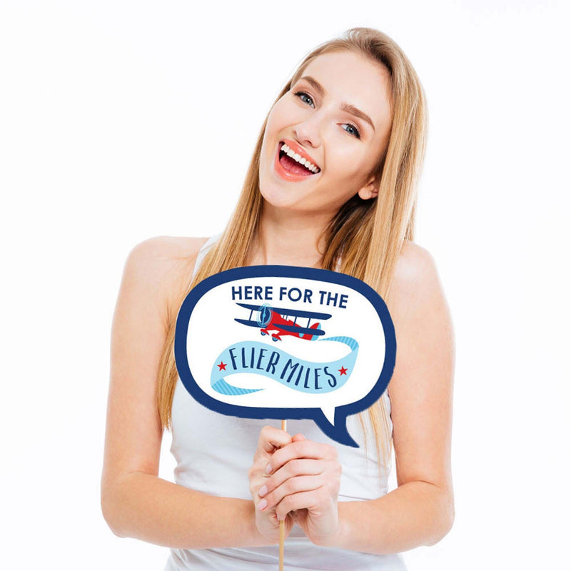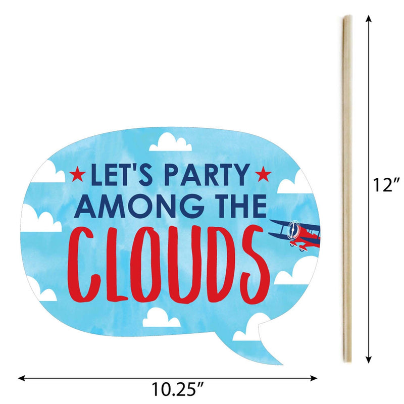 The perfect photo booth begins with fabulous photo booth props. Our printed and cut kit will help you easily create fun party photos at your next Baby Shower or Birthday Party. This Funny Taking Flight - Airplane prop kit comes with 10 pieces and is ready for quick assembly. Simply add the included dowels to each piece, attaching with the included clear stickers, and display alongside a fun photo booth backdrop. Your friends and family will love the fun photos they will create with this amazing 10 piece Funny Taking Flight - Airplane Photo Booth Prop Kit.