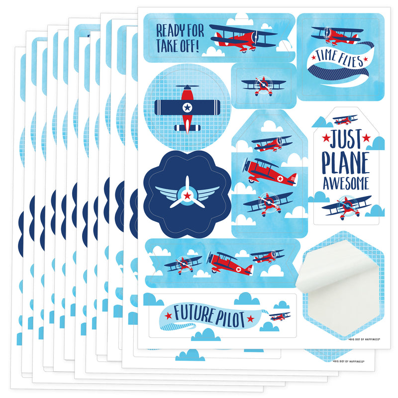Elevate your celebration with Taking Flight - Airplane Party Favor Stickers! This pack includes 12 sheets with 10 stickers per sheet and are perfect for your Baby Shower or Birthday Party. Present the vintage plane stickers to your partygoers in a variety of ways! Enclose them with the invitation, place them inside a coordinating popcorn favor box, or add them to table place settings. Professionally printed, each sticker sheet features an assortment of vibrant blue and red designs. A cute aesthetic to your festivities, the favor stickers are a fun token of appreciation that will delight your guests. Make your celebration even more memorable when you use the Taking Flight - Airplane labels as scrapbook stickers or reward stickers for kids!