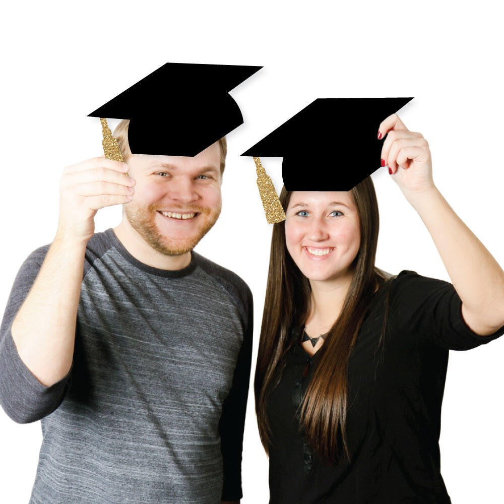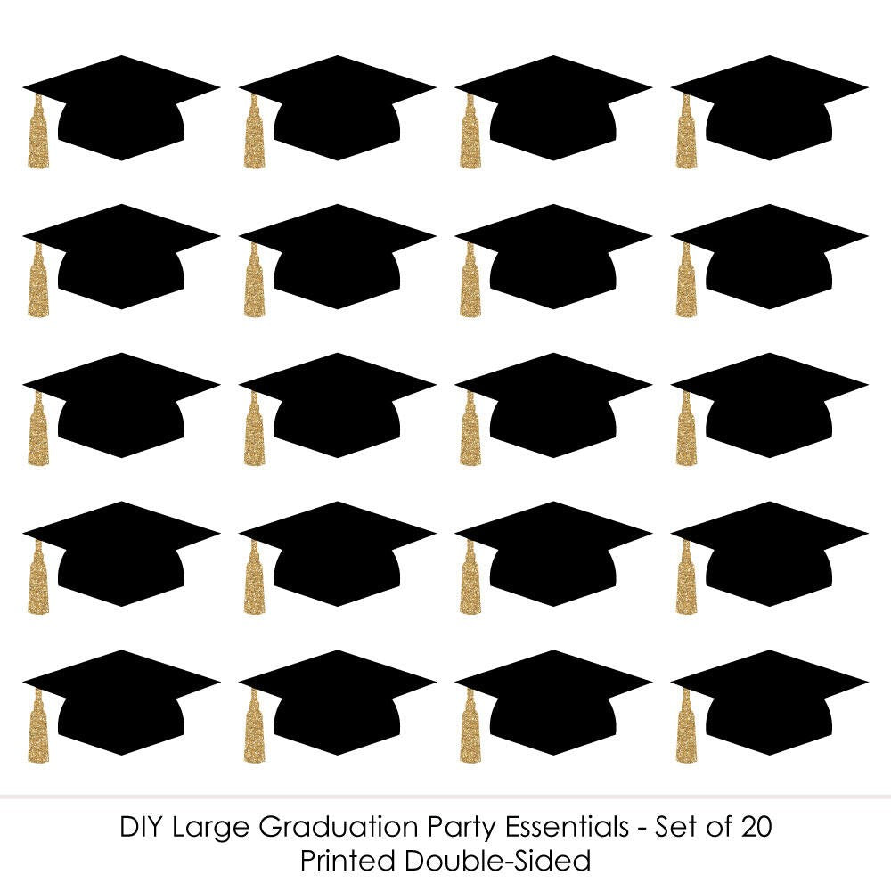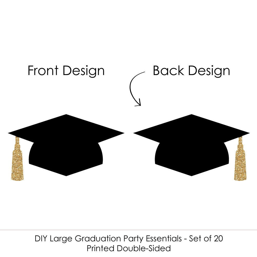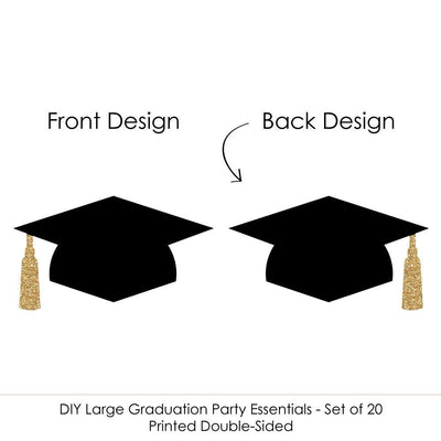 Fill your party space with festive graduation decorations when you use these extra-large hat-shaped cut outs for all of your DIY party ideas. The gold tassel accents will really make your graduation décor stand out. Grad hat die-cut party décor looks great when used as wall decorations, bunting banners, even as centerpieces or at your buffet table. You can even attach your grad photos to them for a festive display. Best of all, this set of Gold Graduation Hat DIY Large Die-Cut Party Décor will arrive printed on each side so you can hang them from the ceiling or create fun balloon displays when you tie them to the balloon strings. Grad hat party décor kits are sure to help you style an impressive graduation party