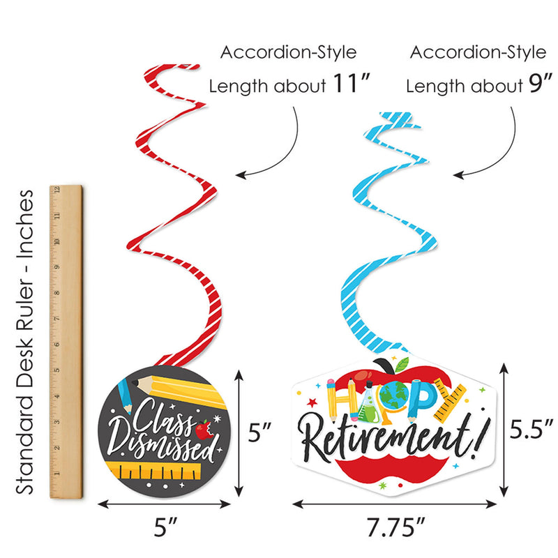 Take your Happy Retirement Party to the next level when you add Teacher Retirement Party Decoration Swirls. Professionally printed and double-sided on heavy-duty cardstock paper, this set of 40 swirls (10 count per shape) all hang below accordion-style spirals with included clear hooks. Each decoration swirl in the 40-piece hanging decor set has a pre-cut hole for easy assembly using the included clear hooks. Party Decoration Swirls will arrive flat. Take a clear hook and insert the bottom bar into the pre-cut hole. Once the clear hook is fastened, gently stretch the swirl and hang it up. Add a pop of color when displayed over the gift table or dessert buffet. Or, add your own string if you would like them to hang lower in your party space.