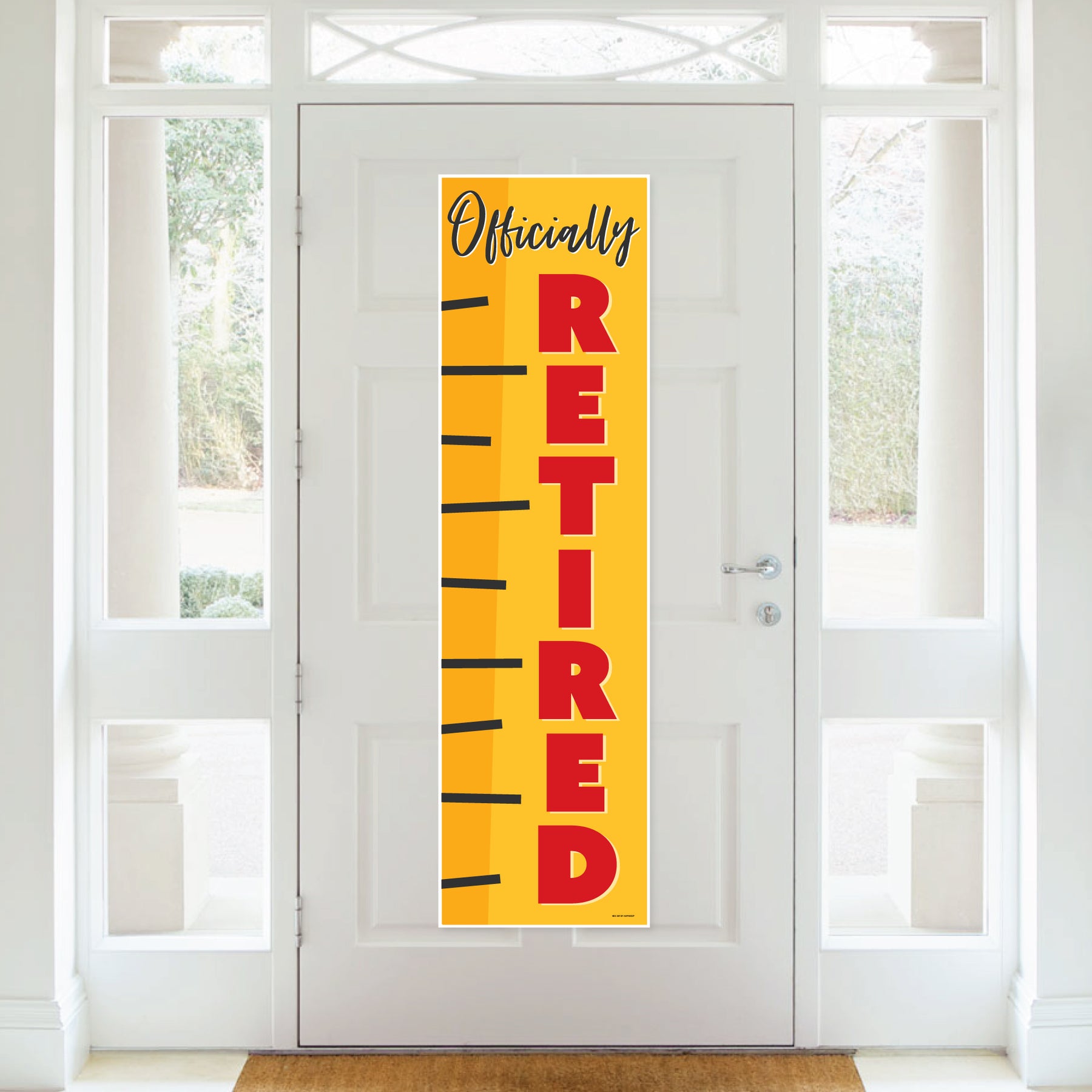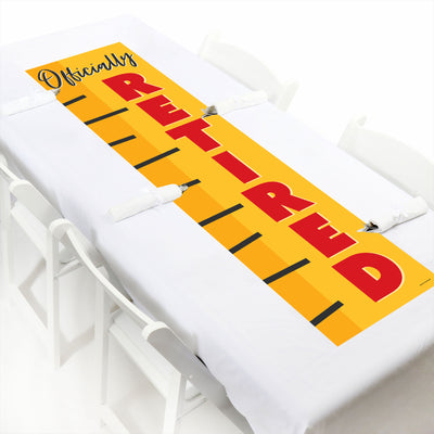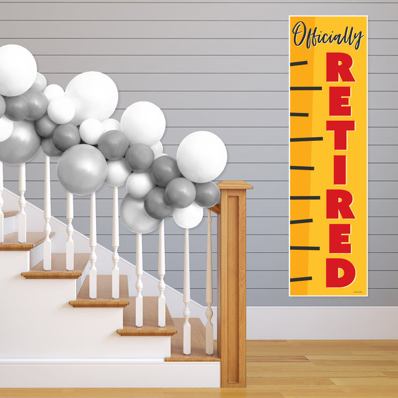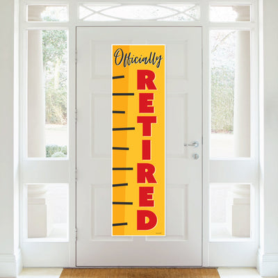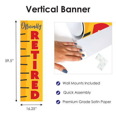 Create a memorable and stylish atmosphere at your celebration when you decorate with the Teacher Retirement Vertical Banner. Perfect for your Happy Retirement Party, the “Officially Retired” banner will wow your guests & add a festive flair to all areas of your event. Simply unroll the Teacher Retirement banner, attach the included poster mounts, and then display the banner in your desired location. (TIP: To flatten your banner, roll it in the opposite direction.) You can hang your banner on the wall or welcome guests when you put the banner on your front door. Fun and easy to use, the Teacher Retirement vertical decoration will also look excellent in a photo booth backdrop and can be used as a paper table runner. No need to worry about spills! The banner is water-resistant and will stay flawless even when it is wet! Professionally printed on premium satin paper with vibrant colors, the Teacher Retirement banner is a showstopping addition to your party decor. Bring your party to the next level when you hang up the Teacher Retirement Vertical Banner.