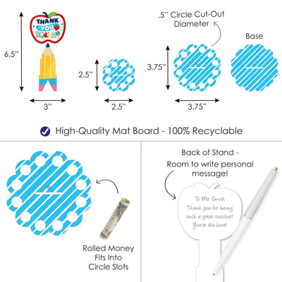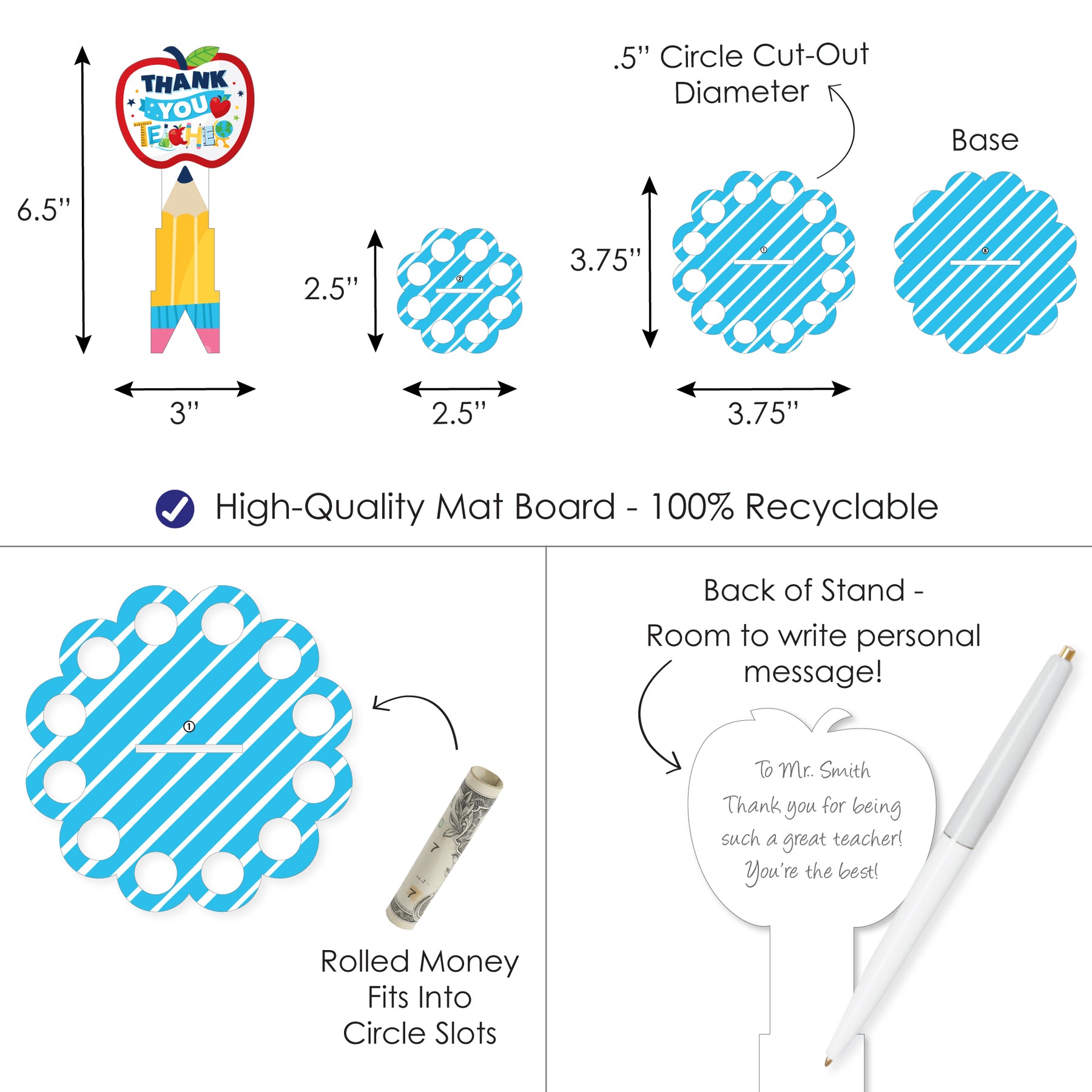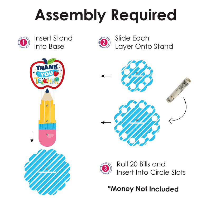 Wow the guest of honor when you present them with a Thank You Teachers Cash Cake at their Teacher Appreciation Party! A fun and creative way to gift money, this DIY apple shaped cash holder stand kit comes in a 2-tier cake shape when put together and will have 20 slots, size 0.5” in diameter, that can hold your rolled money. To assemble, simply attach the centerpiece stand through the base piece and fold the half-circle ends at the bottom in opposite directions. Secure them into place using adhesive dots. Then, slide your layers onto the stand and add your rolled-up bills into the circle slots. For a special touch, add in some rolled-up advice notes or write a personalized message on the backside of the stand. The multicolor cash holder is an impressive gift and table party decoration statement piece that will delight your teacher and partygoers with its eye-catching display. They will appreciate receiving a practical and meaningful gift and enjoy the flexibility of using the cash gift however they choose. Surprise your recipient when you gift them with the Thank You Teachers Cash Cake.