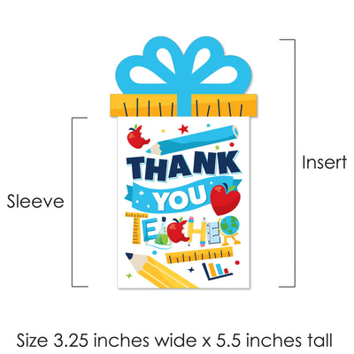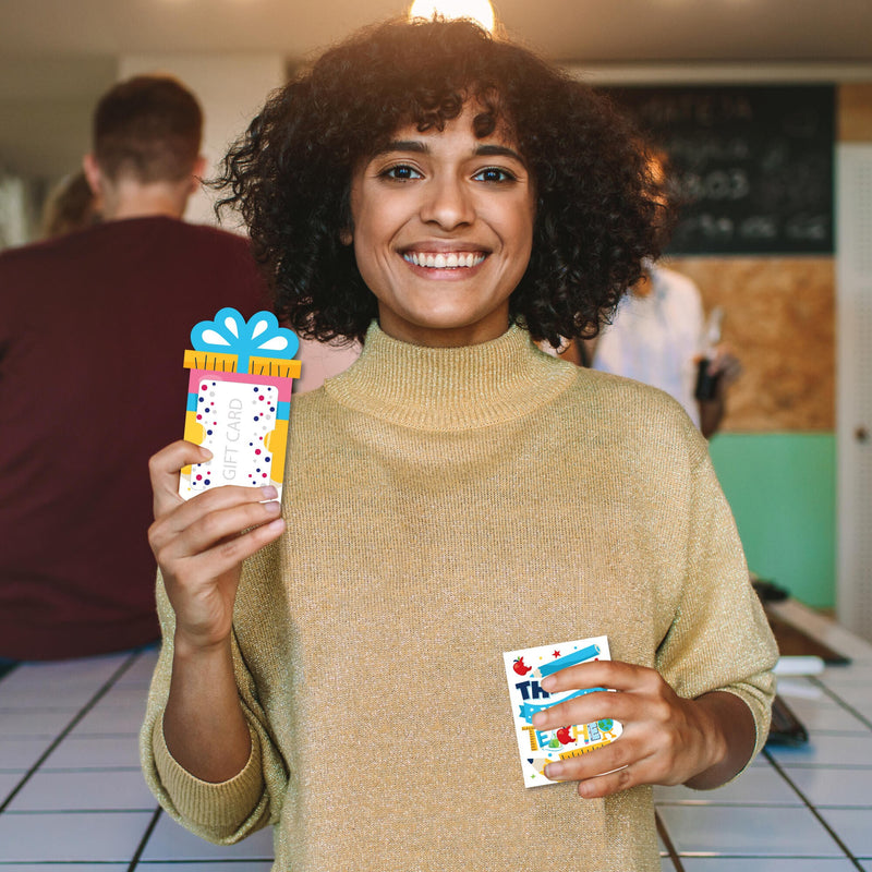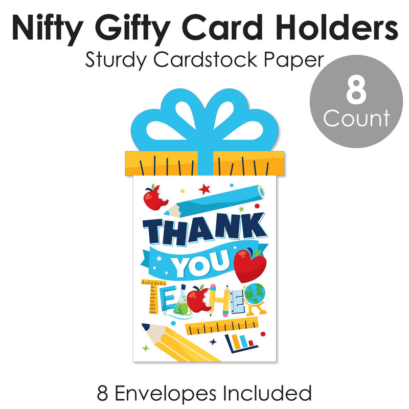 Take the guesswork out of “what to give” your guests of honor when you hand them these Thank You Teachers Nifty Gifty Card Holders filled with money or pre-paid gift cards. Each card holder is professionally printed on heavy-duty cardstock paper, with a unique cut and design that is sure to stand out. To prepare your gift, simply pull the insert out of the card holder sleeve and insert money or a gift card into the pre-cut tabs. You can even use the space on the back of the insert to write a personal message. For all your next Teacher Appreciation parties, these card holders are a convenient and easy way to show how much you care!