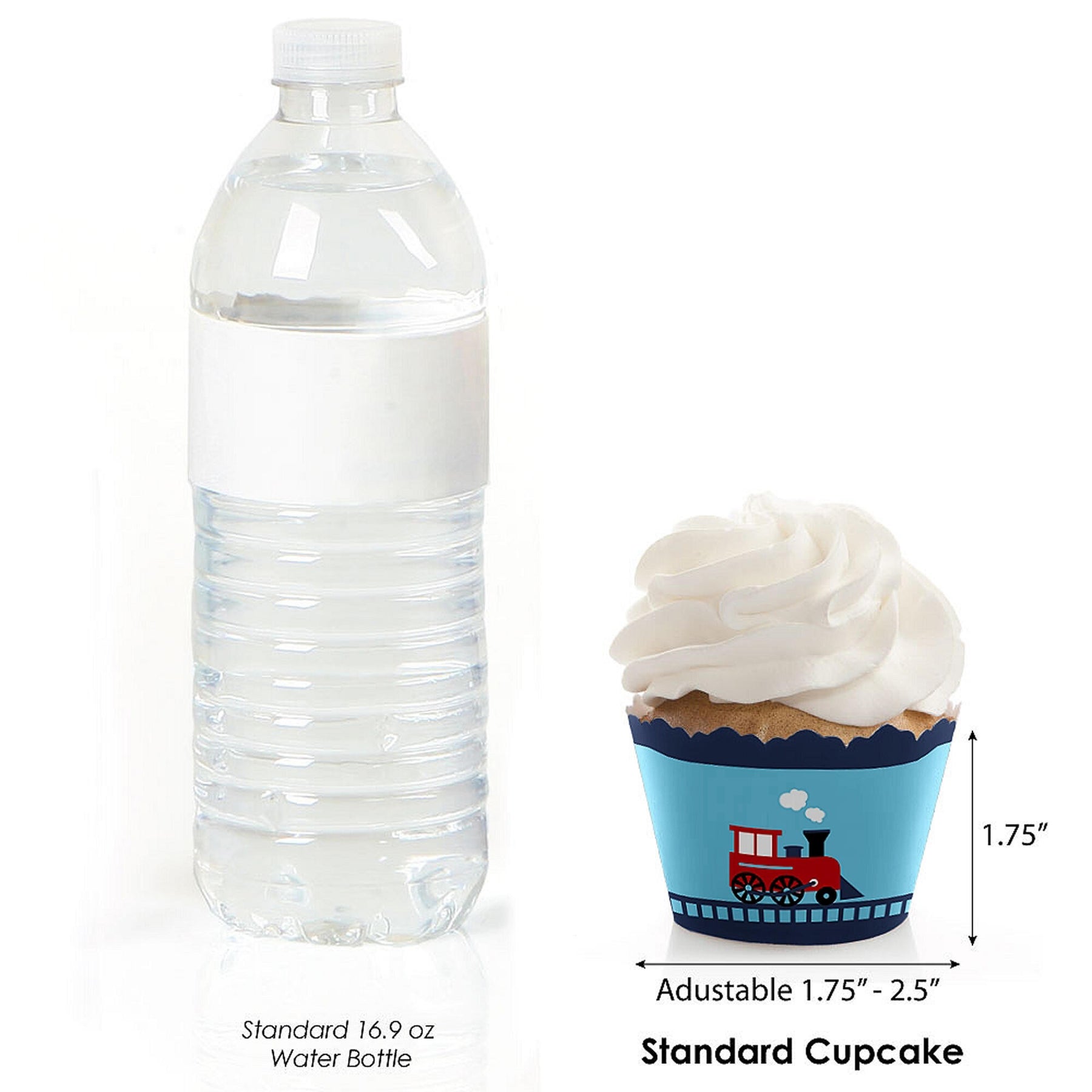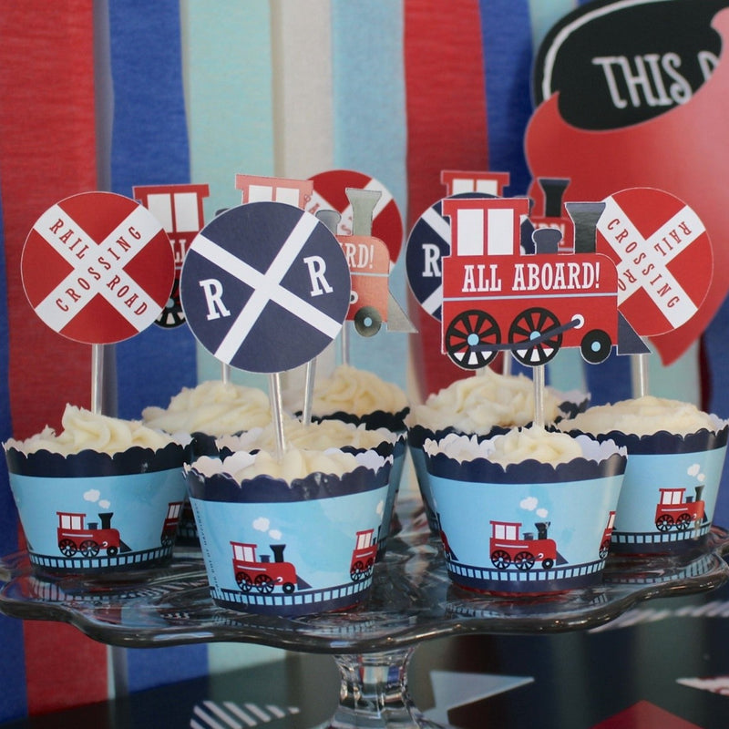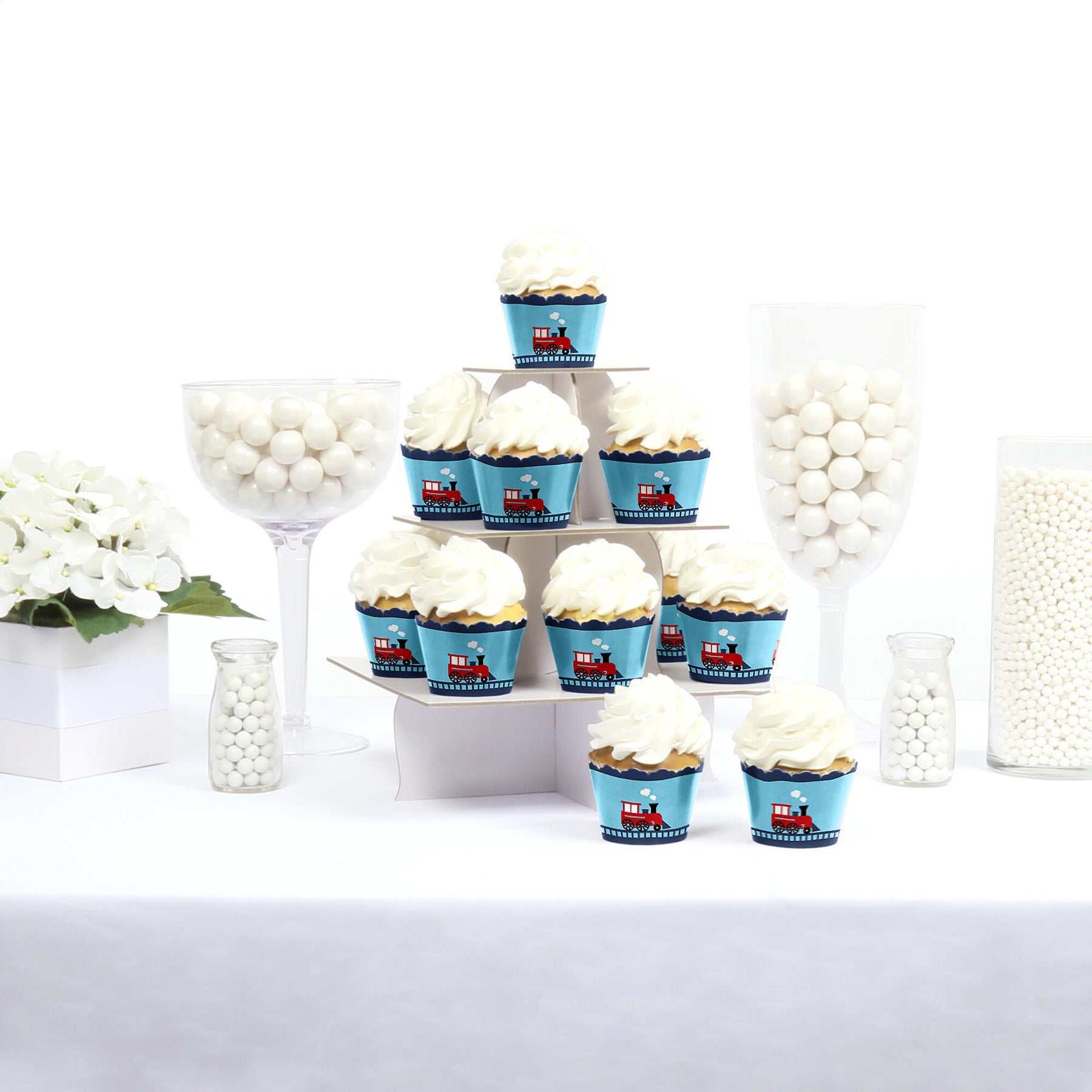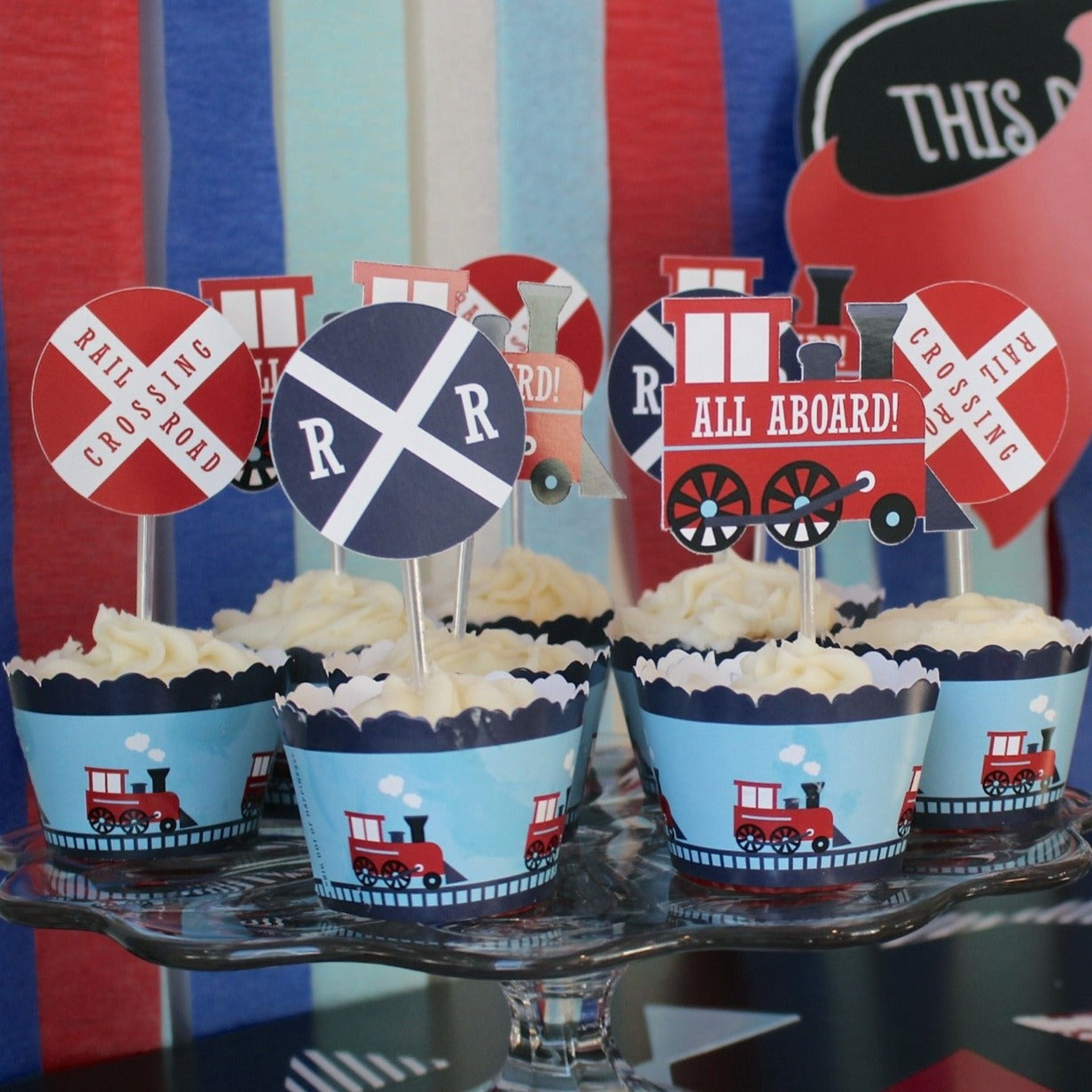 Introducing the new alternative to a traditional cake..Train party cupcake wrappers! Cupcake wrappers are a simple, yet functional treat for each guests' dessert. These are a quick and easy, do-it-yourself project that will also spice up your treat table or each place setting with your coordinating theme. They're printed on premium-grade paper that's cut with a decorative edge, are meant to be placed on the cupcake after baking, and designed to fit easily around standard, frosted cupcakes. There’s no need to spend hours in the kitchen decorating your own cupcakes when it's so easy to use our Train - party cupcake wrappers! Don’t forget to check out our coordinating cupcake picks to top them off!