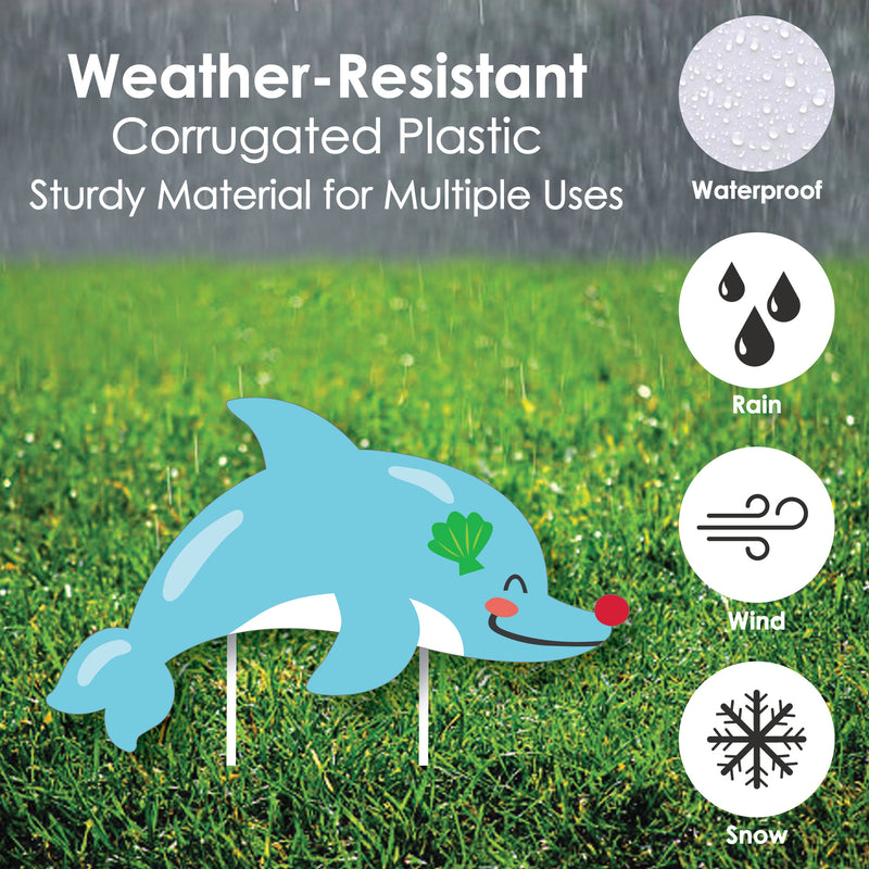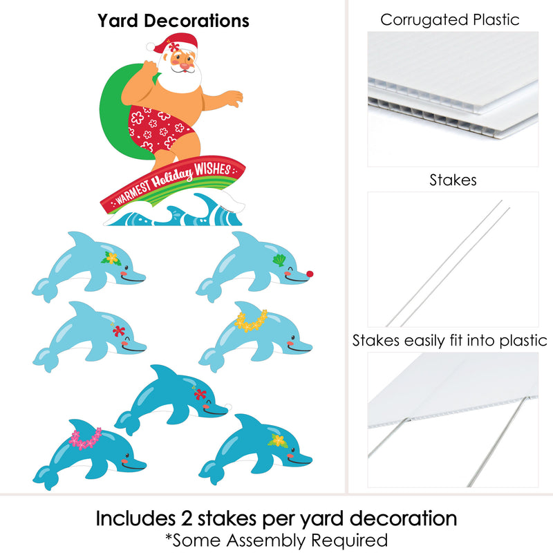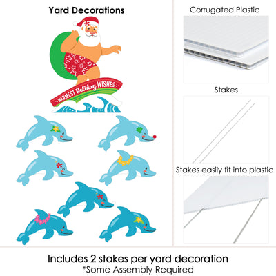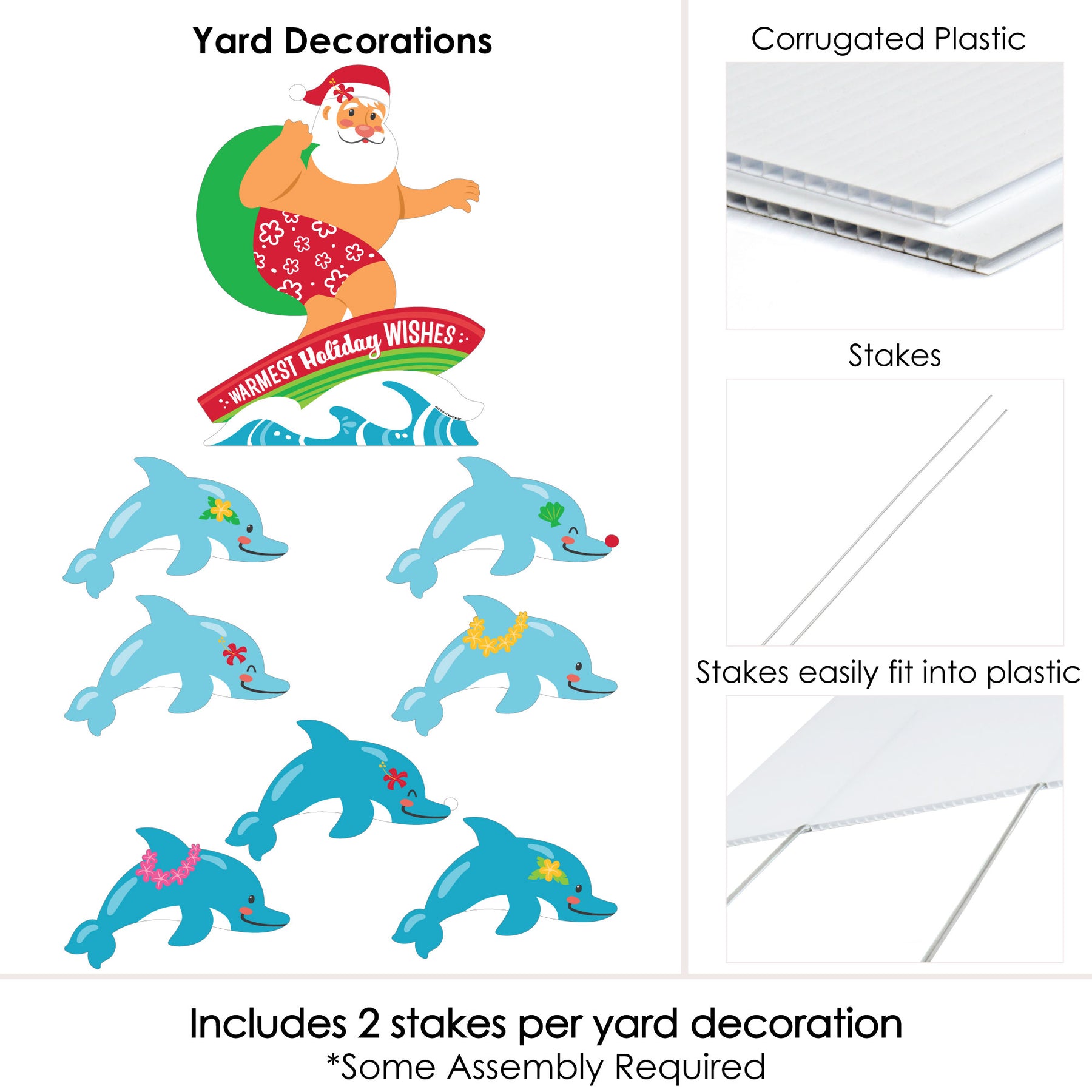 An impressive Tropical Christmas yard sign is sure to delight your guests and surprise everyone. This 8-piece set of Tropical Christmas lawn decorations is professionally printed with vivid colors to really make a statement wherever it is used. Each outdoor shape comes with two stakes, making it easy to display on lawns, driveways or courtyards. Best of all, Tropical Christmas shapes are cut separately so you can arrange them any way you please. These Beach Santa Holiday Party decorative yard signs are made of waterproof plastic and are weather resistant, perfect for short-term display but can be used again and again with proper care.