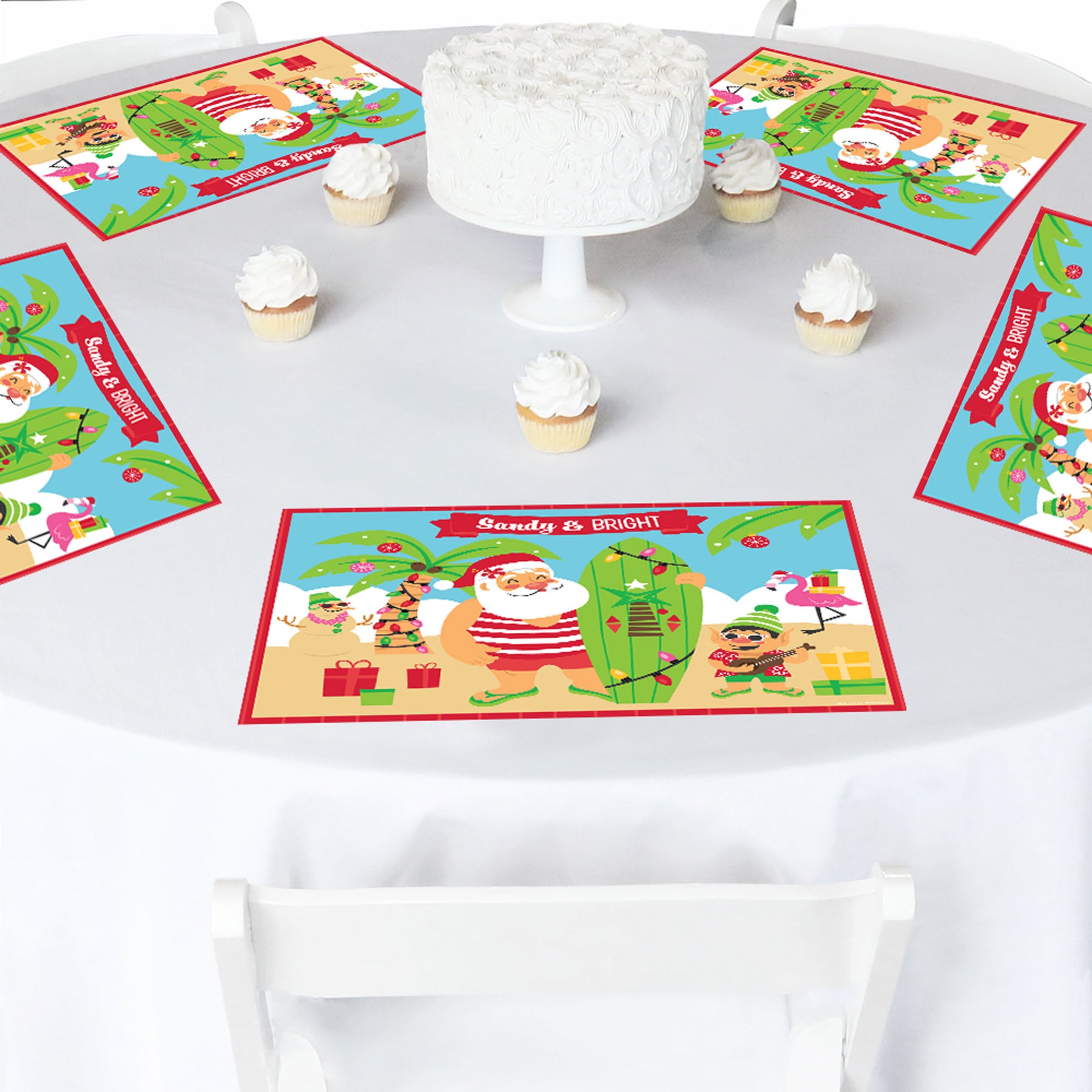 Tropical Christmas Coloring Sheets Activity Placemats are the perfect party entertainment for kids and easy party decoration for a Beach Santa Holiday Party. Beach Santa Holiday Party placemats are professionally printed double-sided on sturdy cardstock paper. Front side features our Tropical Christmas theme design with a photo-like shine. Flip the placemat over for kid friendly activities, games, and coloring section. Made of sturdy cardstock paper, these disposable placemats will make it easy to clean up after the party is over.