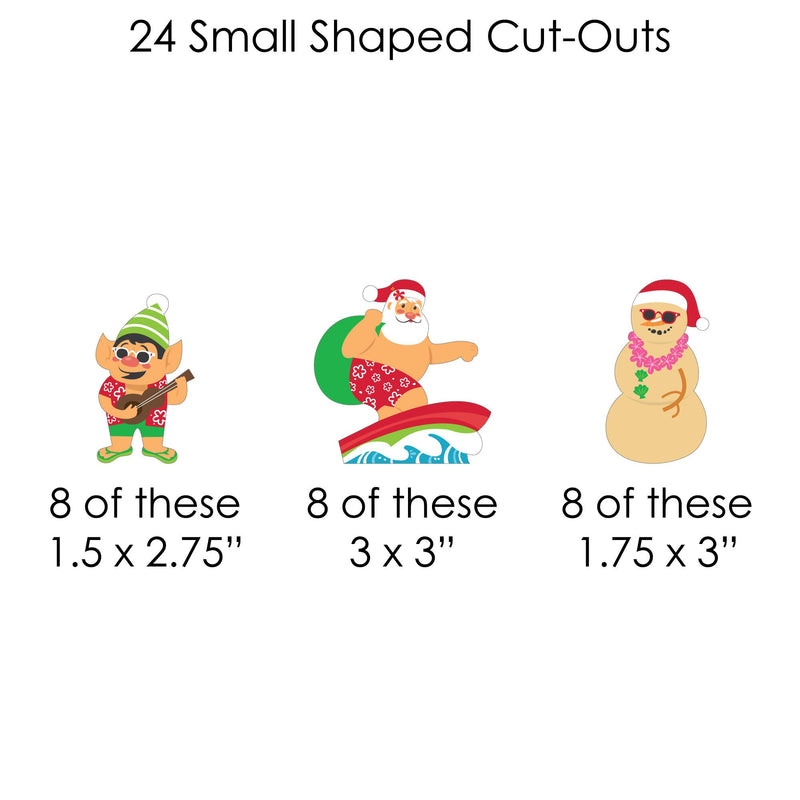 Easily decorate your Beach Santa Holiday Party with Tropical Christmas clothespin garland banner. This DIY banner kit includes 44-pieces of Tropical Christmas paper cut-outs, 50 mini clothespins, and white cord. Before hanging, plan out your desired pattern by alternating in sizes. Using a miniature clothespin, clip shapes on the included cord. Hang finished DIY garland banner at the entrance of your party, over mantelpiece, along buffet tables, or as high chair banner decoration. After the party, reuse the clothespins and cord to hang event photos as a fun keepsake. Tropical Christmas large cut-outs are professionally printed double-sided, small cut-outs are professionally printed with coordinating pattern on back, and all on sturdy cardstock paper with a photo-like shine.