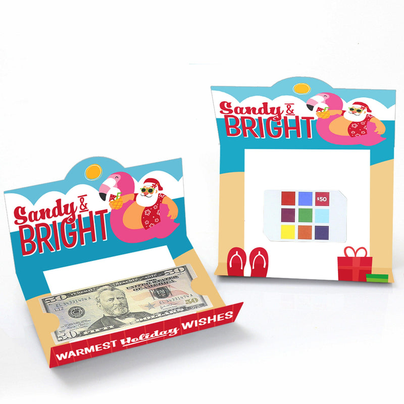 Give a gift everyone will love when you fill these Tropical Christmas enclosure cards with cash or a gift card! Each Beach Santa Holiday Party card is professionally printed and cut with two sets of slots so you can choose to gift either money or a pre-paid shopping card. Tropical Christmas money and gift card holders are perfect for gifting to any special people for whom you want to show appreciation - friends, family, coworkers, teachers and coaches.