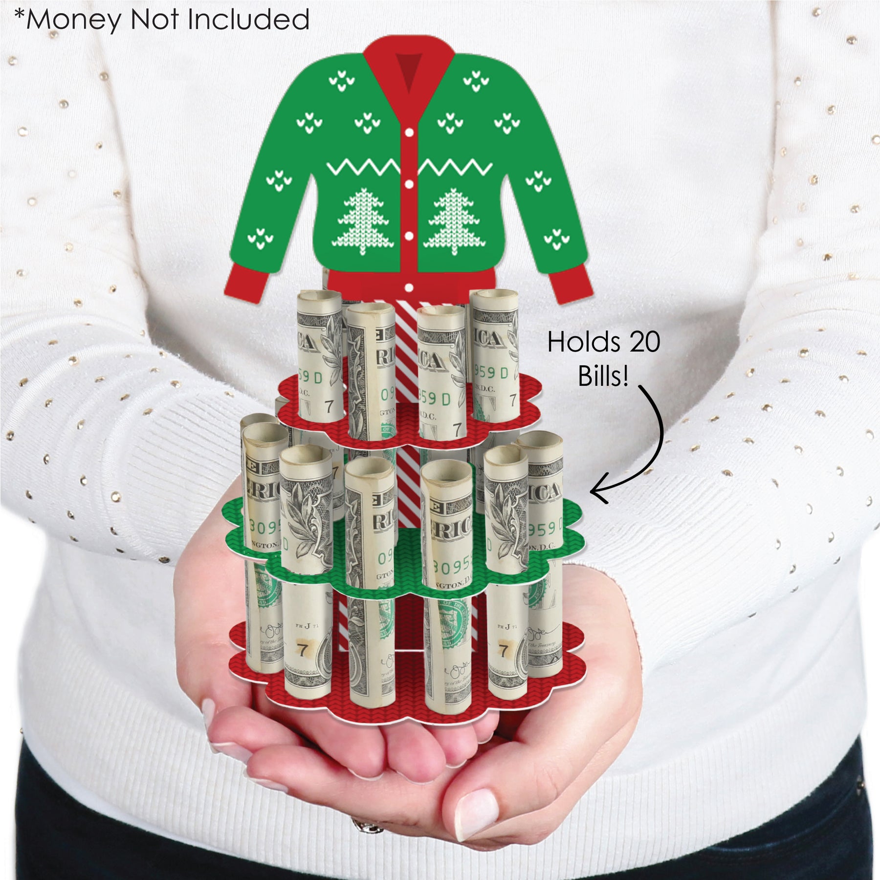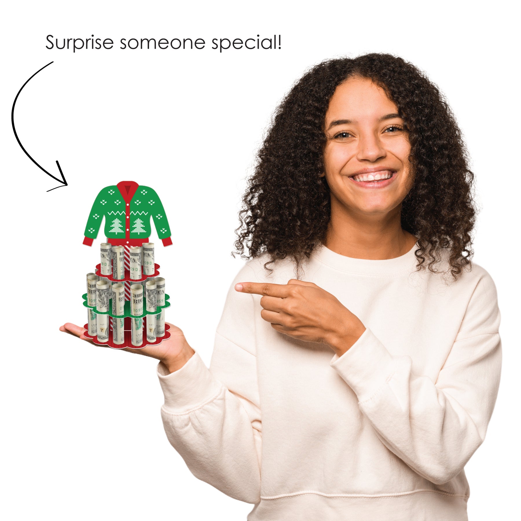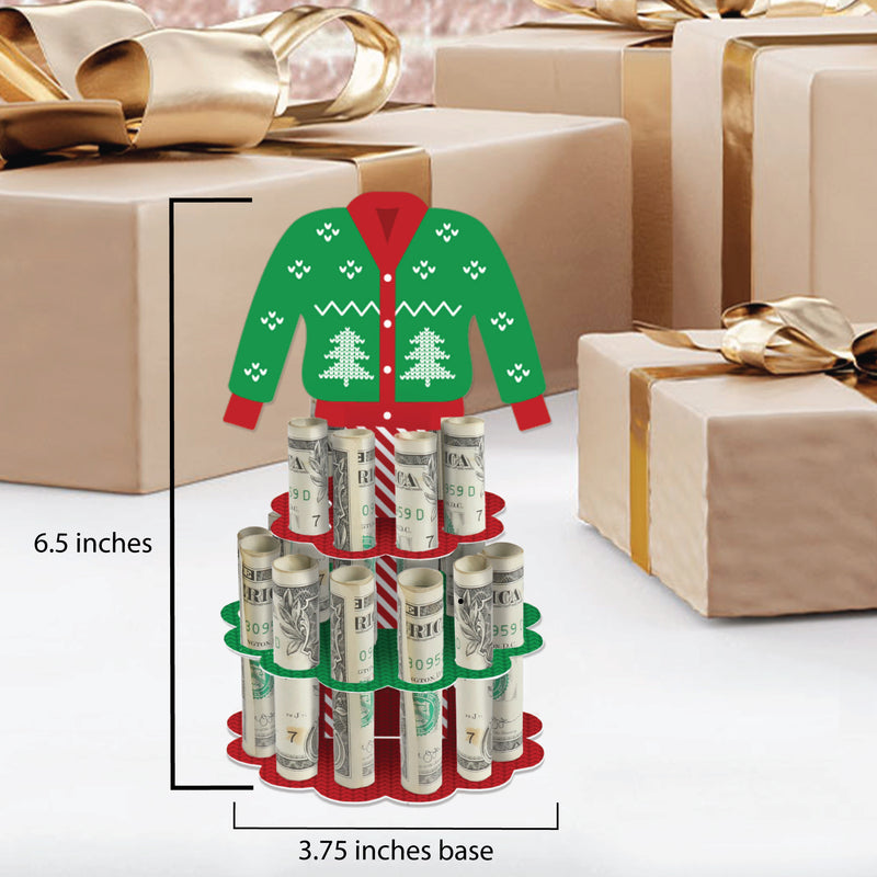 Wow the guest of honor when you present them with an Ugly Sweater Cash Cake at their Holiday and Christmas Party! A fun and creative way to gift money, this DIY sweater cash holder stand kit comes in a 2-tier cake shape when put together and will have 20 slots, size 0.5” in diameter, that can hold your rolled money. To assemble, simply attach the centerpiece stand through the base piece and fold the half-circle ends at the bottom in opposite directions. Secure them into place using adhesive dots. Then, slide your layers onto the stand and add your rolled-up bills into the circle slots. For a special touch, add in some rolled-up advice notes or write a personalized message on the backside of the stand. The sweatshirt cash holder is an impressive gift and table party decoration statement piece that will delight your guest of honor and partygoers with its eye-catching display. They will appreciate receiving a practical and meaningful gift and enjoy the flexibility of using the cash gift however they choose. Surprise your recipient when you gift them with the Ugly Sweater Cash Cake.