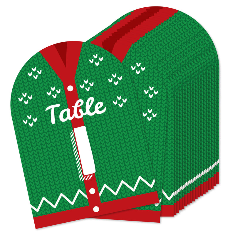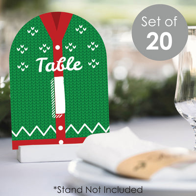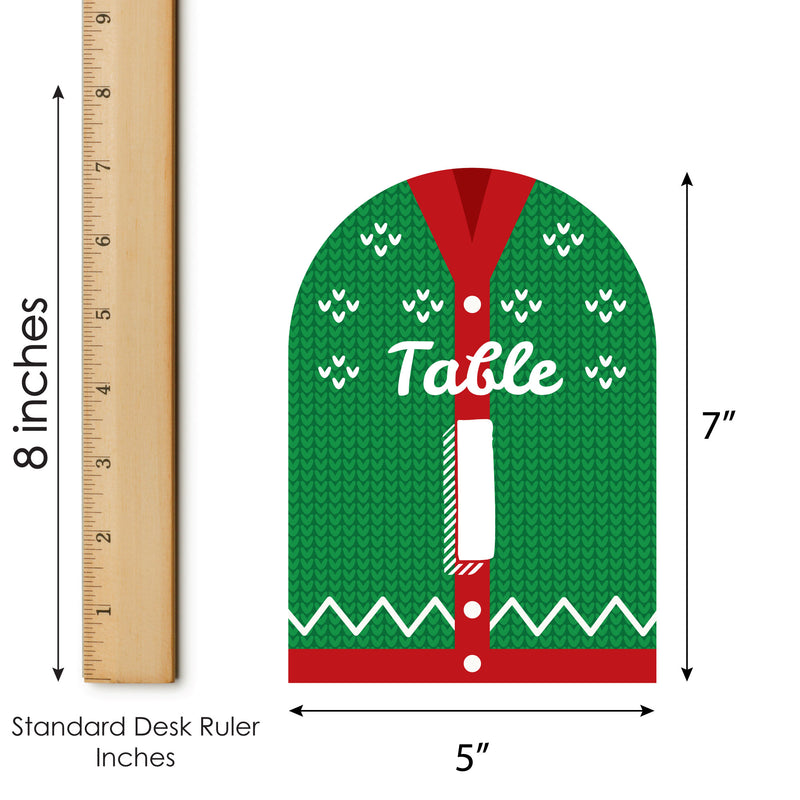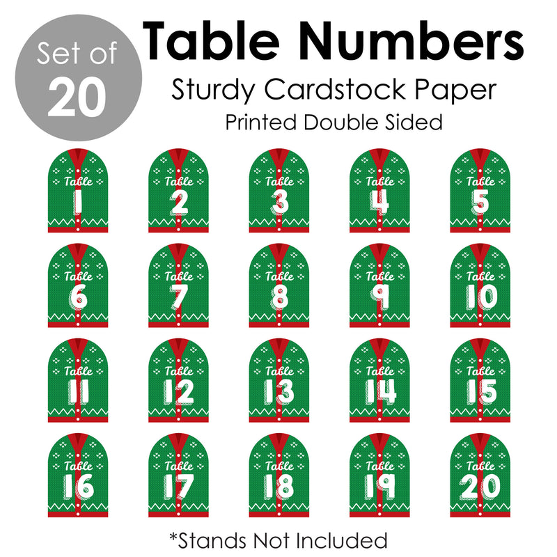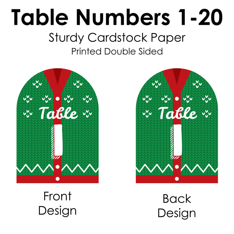 Add a special touch to your table setup with the Ugly Sweater Table Numbers. Ideal for Holiday and Christmas Parties, these charming table cards are numbered 1 through 20 and will stylishly help guide your guests to their tables. The Ugly Sweater Table Numbers are your no-fuss solution to adding that extra flair to your party decorations. Simply display at your table with your own stand, frame, or holder. You can also create elaborate table centerpieces by pairing the number cards with flowers, vases, and other decorative items. Professionally printed double-sided on sturdy cardstock paper, the Ugly Sweater Table Numbers come in an elegant arch-shaped cut-out design that will draw in attention and make it easy for guests to find their seating. Each card measures to be 5” wide by 7” tall. From large-scale celebrations to smaller get-togethers, the Ugly Sweater Table Numbers is the perfect party supply to use at your next special event!