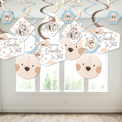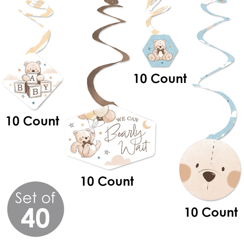 Take your Teddy Bear Baby Shower Party to the next level when you add We Can Bearly Wait Decoration Swirls. Professionally printed and double-sided on heavy-duty cardstock paper, this set of 40 swirls (10 count per shape) all hang below accordion-style spirals with included clear hooks. Each decoration swirl in the 40-piece hanging decor set has a pre-cut hole for easy assembly using the included clear hooks. Party Decoration Swirls will arrive flat. Take a clear hook and insert the bottom bar into the pre-cut hole. Once the clear hook is fastened, gently stretch the swirl and hang it up. Add a pop of color when displayed over the gift table or dessert buffet. Or, add your own string if you would like them to hang lower in your party space.