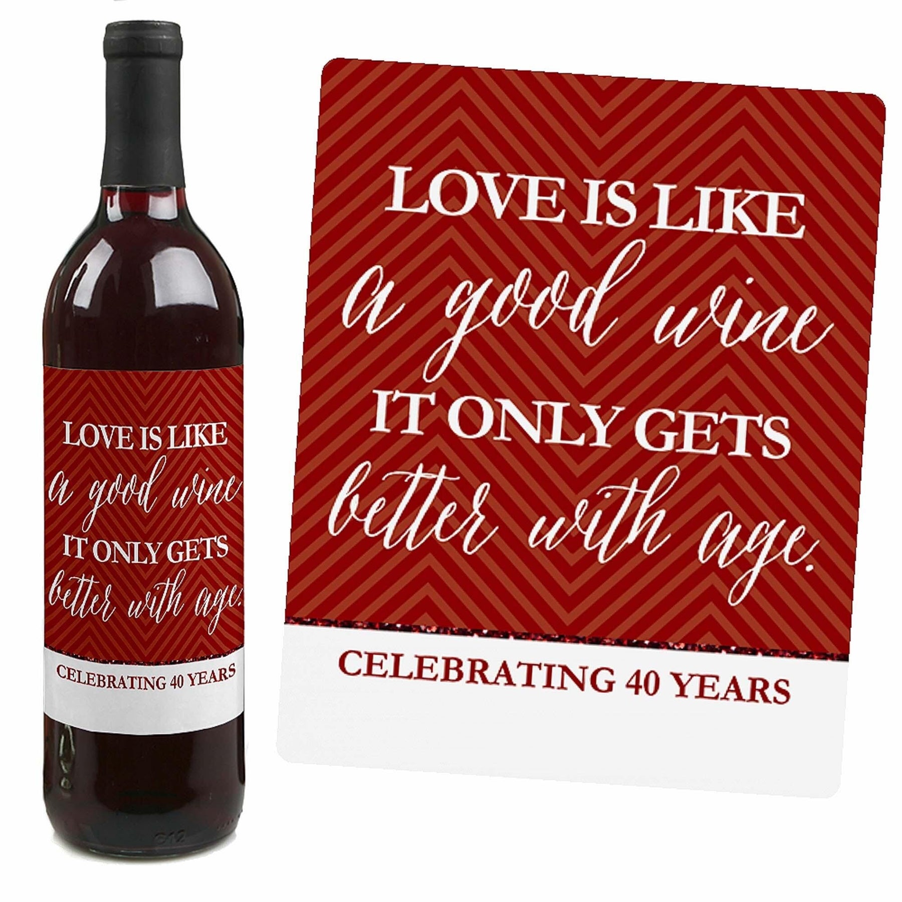 Make the Anniversary Party decorations stand out when you add these fun We Still Do - 40th Wedding Anniversary wine bottle labels to your beverage bar. Each set of four wine bottle labels has four different yet coordinating designs. Add them to standard-sized bottles, either over the original labels or onto bottles that have had their labels removed. We Still Do - 40th Wedding Anniversary wine bottle label stickers will dress up your beverage bar and entertain all your guests.