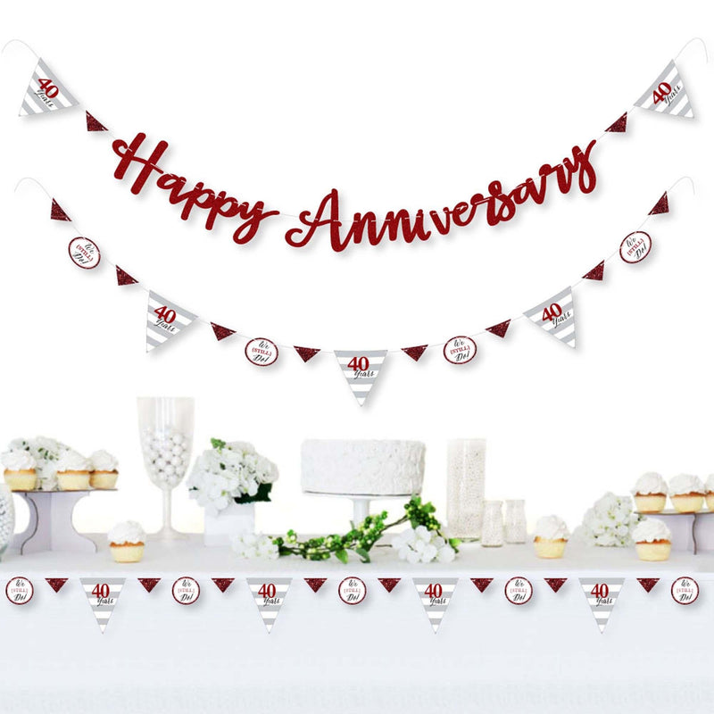 Greet your party guests and the Guest of Honor with an impressive Happy Anniversary banner. We Still Do - 40th Wedding Anniversary Party Letter Banner Decoration is an eye-catching way to decorate for any birthday. The variety of pennant designs and shapes paired with the Happy Anniversary script letters will look great at any venue. Simply string the script letters onto the included cording and then add the pennant shapes in any order you wish. Hang as one large banner or cut into different lengths and display in multiple rows. Letter banner decorations are an easy-to-use party supply for your celebration.