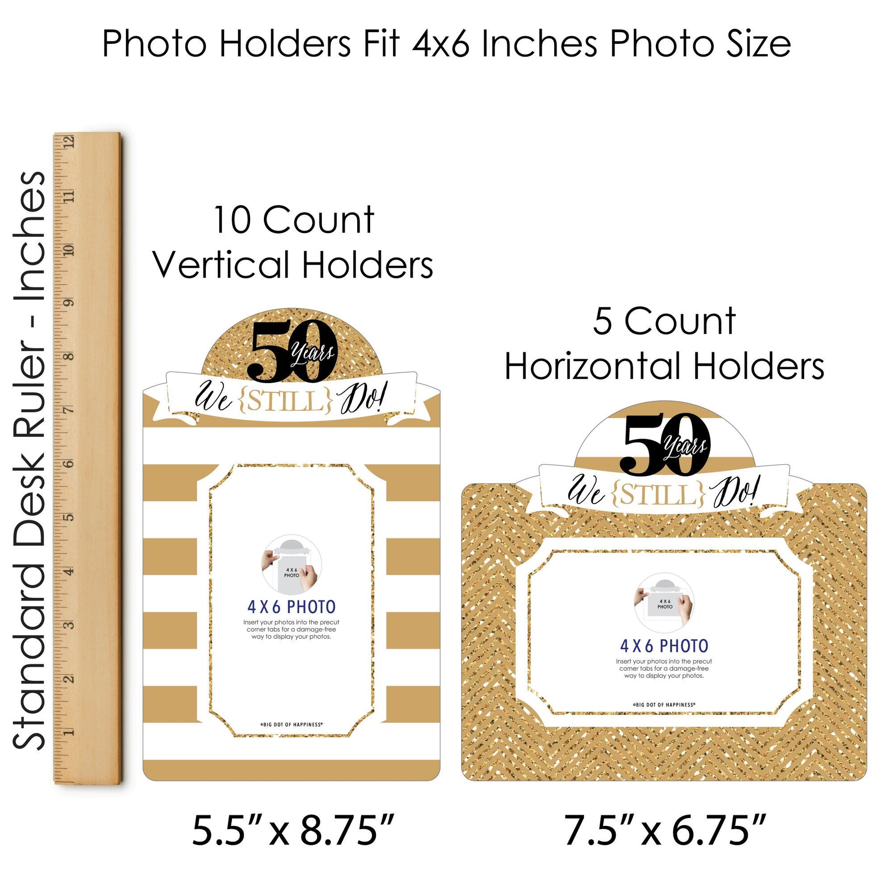 Create picture-perfect centerpieces for your anniversary party with We Still Do - 50th Wedding Anniversary Photo Table Toppers. Photo Table Toppers is a set of 15 heavy-duty cardstock paper photo holder pieces, 15 Sticks, and includes clear assembly stickers for DIY required assembly. Each photo holder has 4 pre-cut slits to tab your own 4x6 photo 10 vertical photo holders and 5 horizontal photo holders. (Note: Your photo will tab through back design of photo holder.) We Still Do - 50th Wedding Anniversary Photo Table Topper decorations can be used as centerpieces when attached to the included sticks and inserted into vases or floral arrangements. They easily accent your anniversary party candy buffet when you add them to apothecary jars. Photo Table Toppers are a great addition to any anniversary party and a fun way to proudly show off the guest of honor.
